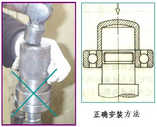 安裝內(nèi)圈(或外圈)過盈配合的軸承,禁止用鐵錘直接敲擊軸承內(nèi)圈(或外圈)端面,這樣很容易把擋邊敲壞。應(yīng)該采用套筒放在內(nèi)圈(或外圈)端面上,用鐵錘敲擊套筒來安裝。