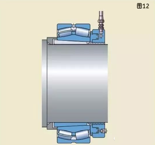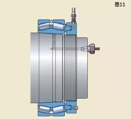 較大軸承需要更大的力來安裝,因此應(yīng)使用液壓螺母。液壓螺母可以把圓錐孔軸承安裝在圓錐形軸徑上(圖11),緊定套上(圖12),退卸套上(圖13)。