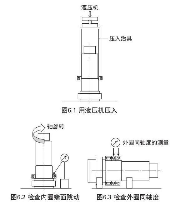 然后,在壓入內(nèi)圈時,應(yīng)使用內(nèi)圈壓入工具,確實將其壓入軸肩(請勿向外圈加力)。壓入后,測量軸承各部位的精度,確認(rèn)是否確實安裝在軸上。另外,組配使用多列軸承時,在組裝后應(yīng)測量其跳動,修正外圈間的軸心偏差。