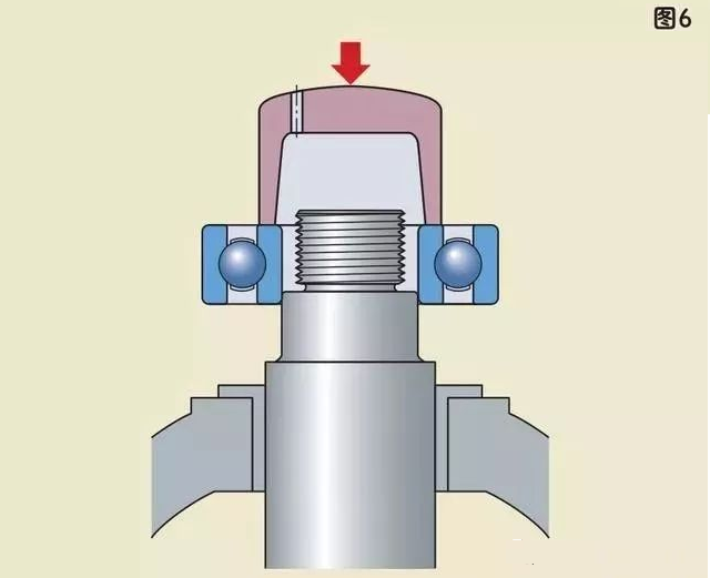安裝內(nèi)圈過盈配合的軸承時,不能通過外圈和滾動體把力傳遞給內(nèi)圈。這會把軸承滾道和滾動體表面敲壞,使軸承在運轉(zhuǎn)時產(chǎn)生噪音并提前損壞。正確的方法應(yīng)該用套筒直接把力作用在內(nèi)圈端面上。